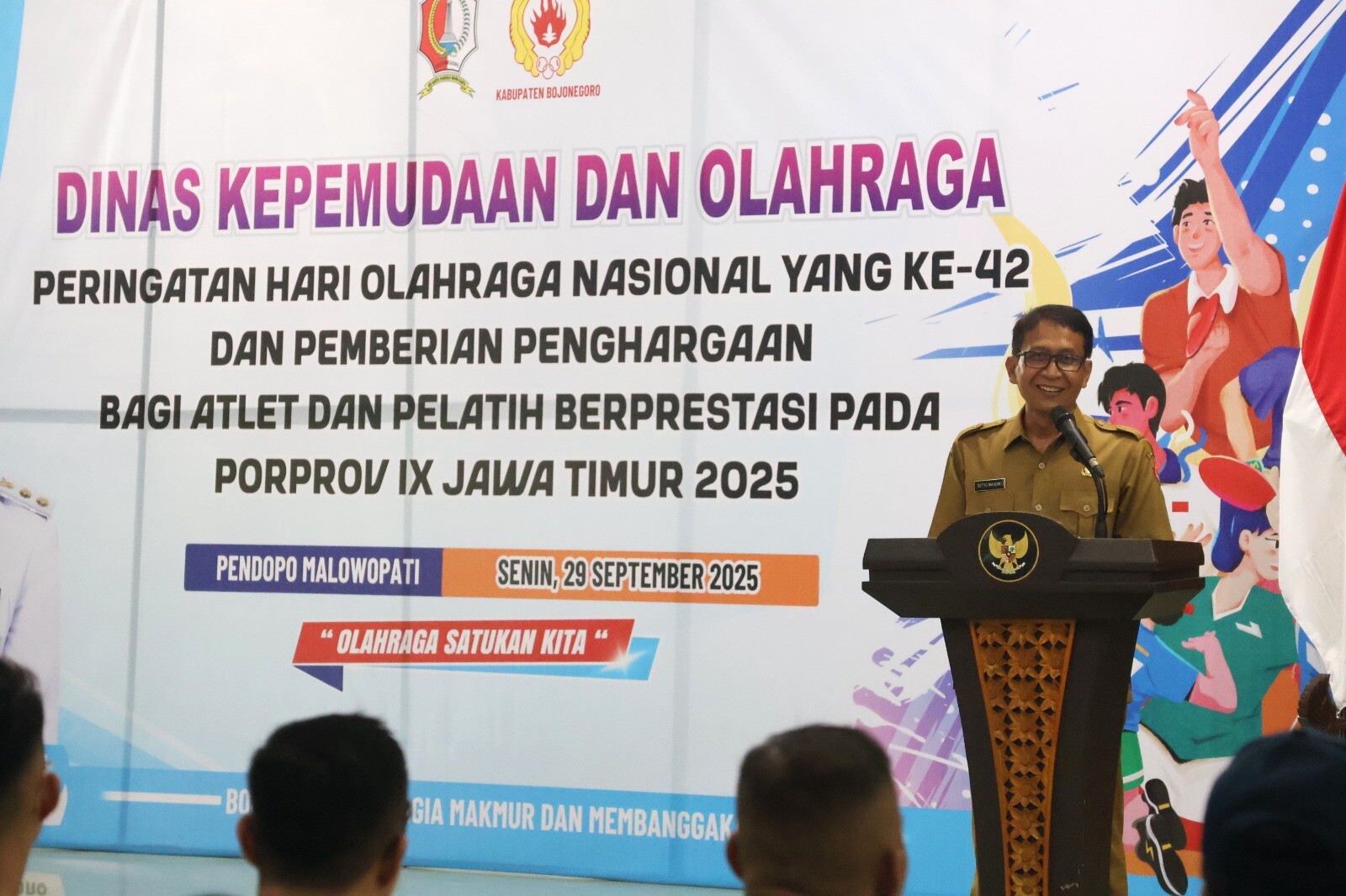 Bojonegorokab.go.id - Bupati Bojonegoro Setyo Wahono mengapresiasi para atlet dan pelatih yang telah mengharumkan nama Bojonegoro di Pekan Olahraga Provinsi (Porprov) IX Jatim 2025. Hal ini diungkapkan pada agenda Peringatan Hari Olahraga Nasional Ke-42 sekaligus pemberian penghargaan bagi atlet dan pelatih berprestasi Porprov IX Jatim 2025, yang dilaksanakan di Pendopo Malowopati, Senin (29/9/2025).