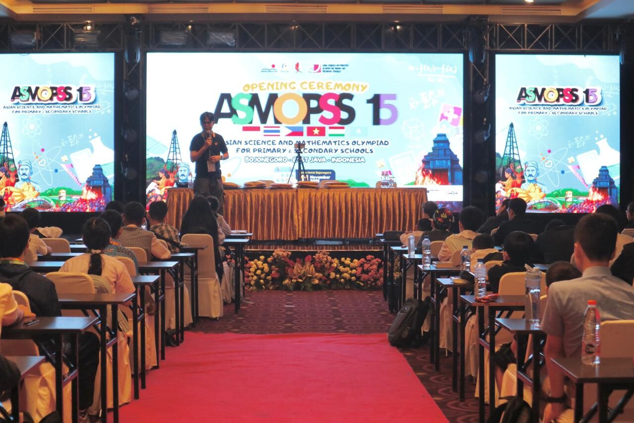 Bojonegorokab.go.id – Suasana antusias tampak memenuhi ruang utama kegiatan Asian Science and Mathematics Olympiad for Primary and Secondary Schools (ASMOPSS) ke-15 yang digelar di Hotel Aston Kabupaten Bojonegoro, Rabu (12/11/2025). Peserta dari berbagai negara, termasuk peserta dari Bojonegoro (Indonesia), serius mengikuti kompetisi yang menguji kemampuan sains dan matematika tingkat internasional tersebut.