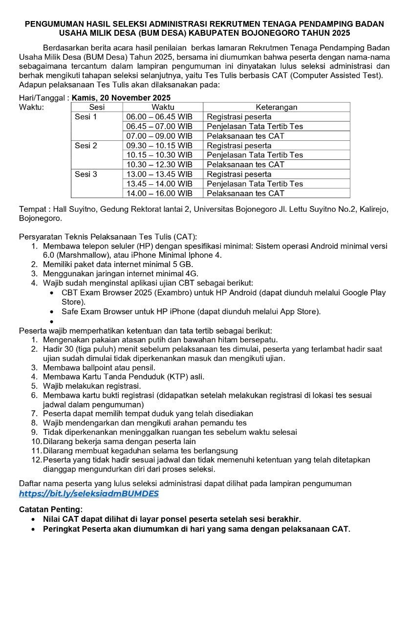 Pengumuman Tes Tulis Rekrutmen Tenaga Pendamping BUM Desa Kabupaten Bojonegoro Tahun 2025
