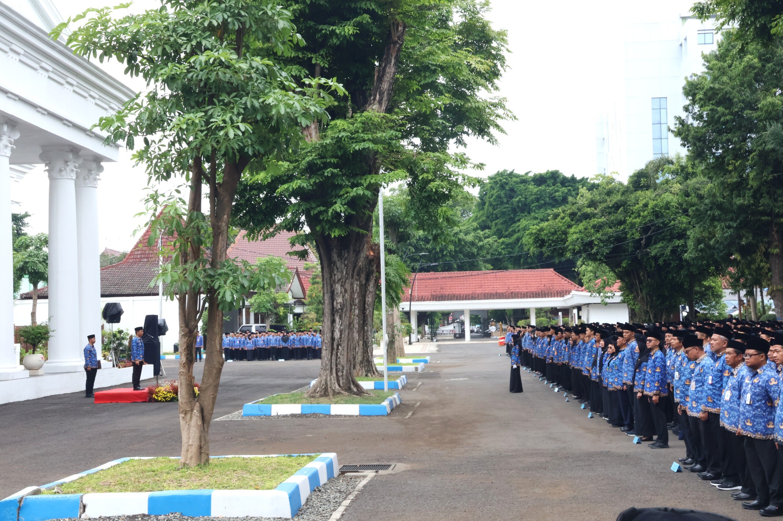 Bojonegorokab.go.id - Pemerintah Kabupaten Bojonegoro memperingati tiga momentum besar meliputi HUT Korps Pegawai Republik Indonesia (Korpri) ke-54, Hari Guru Nasional ke-80 dan Hari Kesehatan Nasional ke-61, Senin (1/12/2025) di halaman Gedung Putih. Ketiganya menjadi pondasi penting membangun sumber daya manusia yang berkarakter, berintegritas, berinovatif dan berdaya saing.