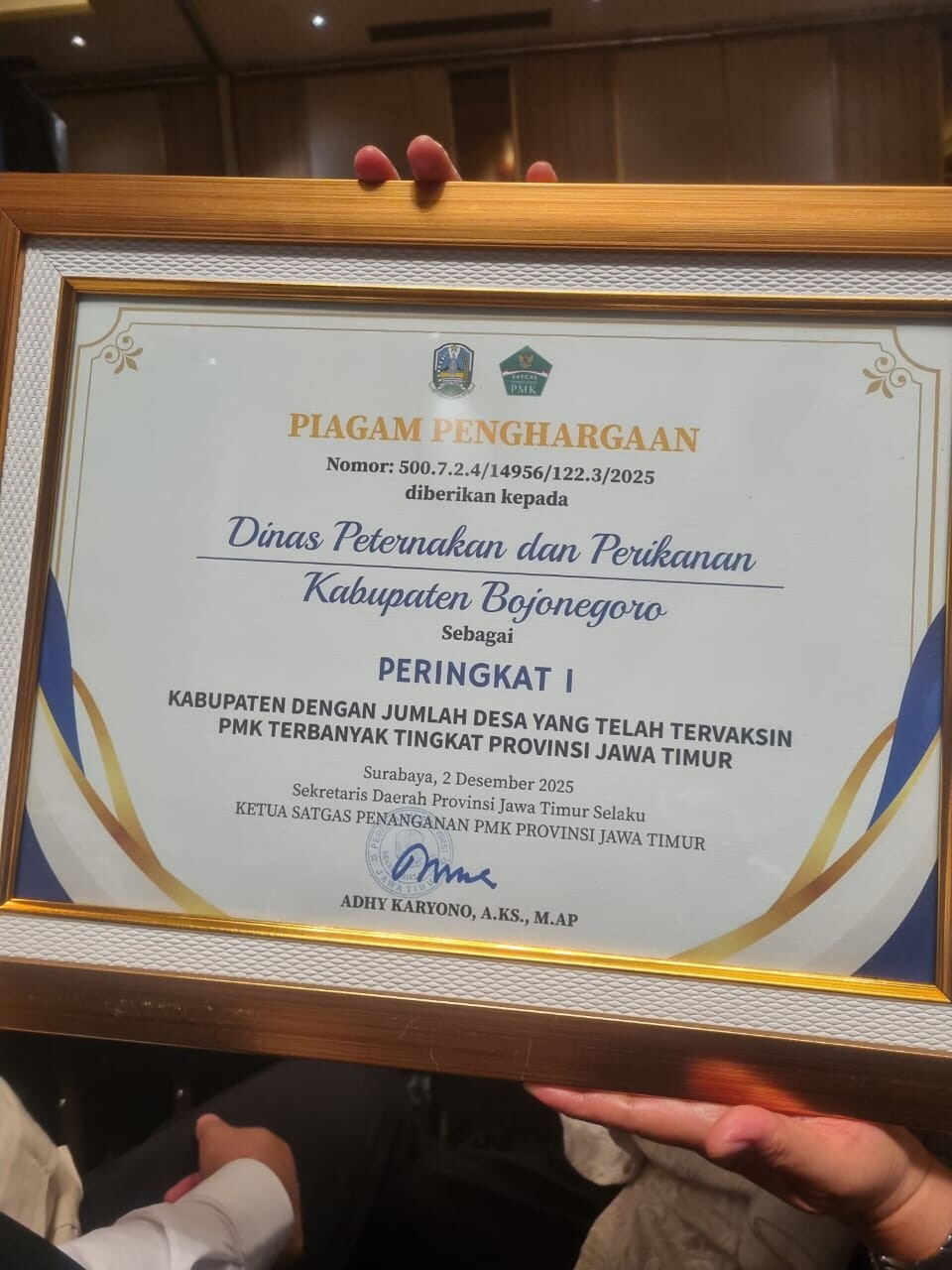 Penghargaan bergengsi ini diberikan berdasarkan kinerja optimal Bojonegoro dalam pelaksanaan vaksinasi PMK di desa-desa, sebagai bagian dari upaya pengendalian dan penanggulangan penyakit yang berdampak besar pada sektor peternakan. Piagam diserahkan langsung oleh Ketua Satgas Penanganan PMK Provinsi Jawa Timur, Adhy Karyono mewakili Sekretariat Daerah Provinsi Jawa Timur.