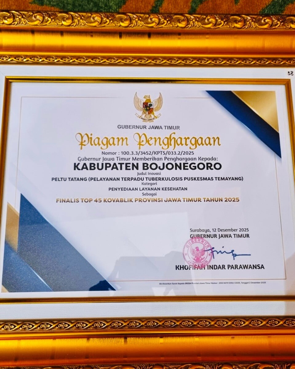 Bojonegorokab.go.id - Puskesmas Temayang, Kabupaten Bojonegoro masuk finalis top 45 pelayanan publik pada Kompetisi lnovasi Pelayanan Publik (KOVABLIK) tahun 2025 tingkat Provinsi Jawa Timur. Inovasi pelayanan ini fokus pada pelayanan Tuberkulosis (TBC) dengan judul inovasi PELTU TATANG (Pelayanan Terpadu Tuberkulosis Puskesmas Temayang).