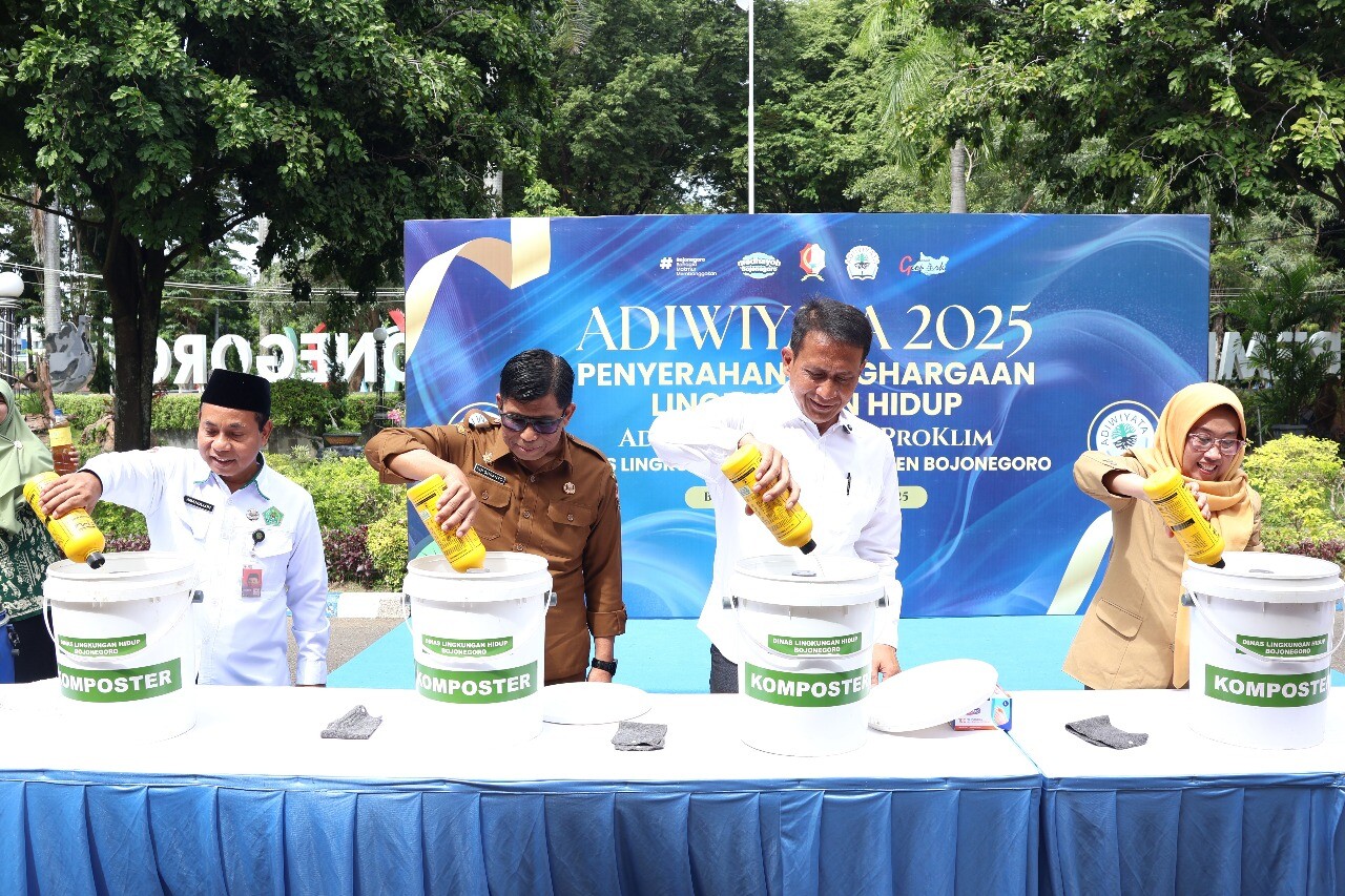 Kegiatan penyerahan penghargaan ditutup dengan praktik pengomposan bersama Bupati Bojonegoro dan tamu undangan sebagai tindak lanjut SE Bupati tentang pengelolaan sampah sekaligus wujud komitmen bersama antara pemerintah, sekolah, dan desa. Pengolahan sampah organik dilakukan secara simbolis dengan mencampurkan bahan “hijau” seperti sisa makanan dan rumput dengan bahan “cokelat” berupa daun kering dan serbuk gergaji, ditambahkan aktivator EM4, serta dijaga kelembaban dan aerasinya hingga terurai menjadi kompos siap pakai.