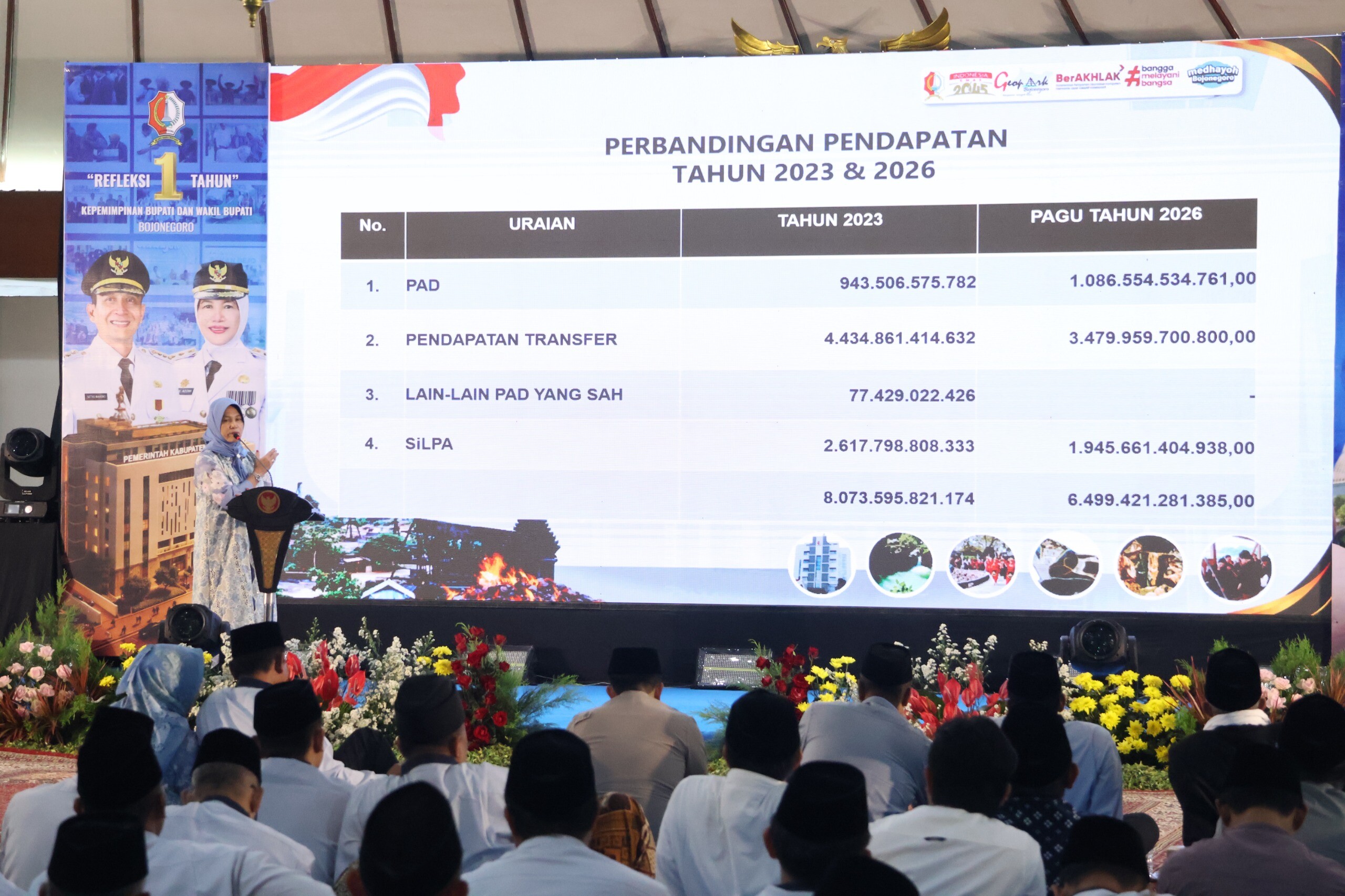 Bertajuk 'Merajut Kebersamaan Membangun Bojonegoro Bahagia, Makmur dan Membanggakan', momen ini bukan sekadar refleksi satu tahun masa jabatan. Melainkan bentuk pertanggungjawaban spiritual dan sosial kepada masyarakat. Acara diawali pemberian santunan kepada anak yatim, marbot masjid, penggali kubur, disabilitas, lansia, dan tukang becak.
