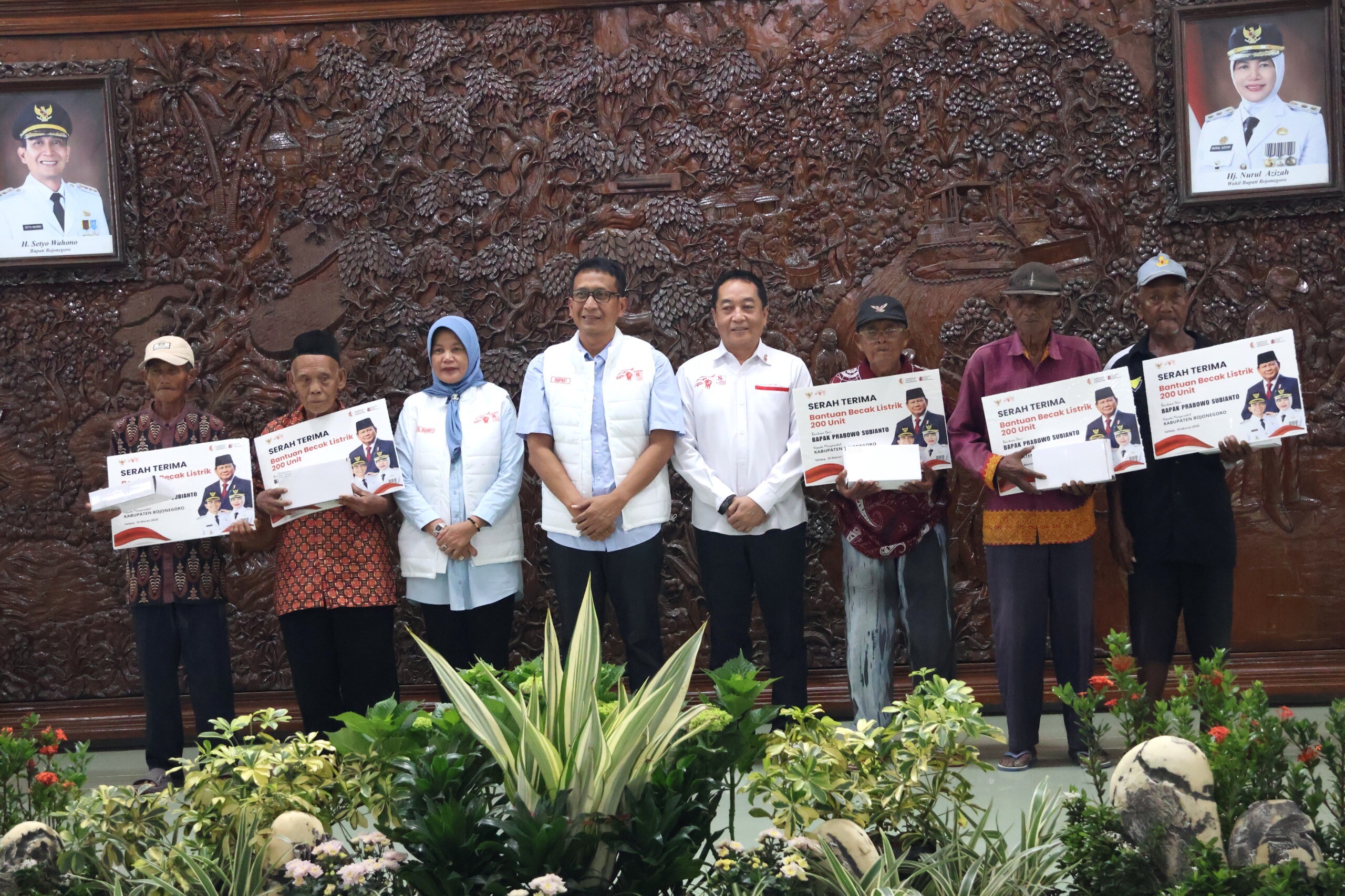 Serah Terima Bantuan Becak Listrik tersebut secara resmi digelar pada Selasa (10/3/2026) di Pendopo Pemkab Bojonegoro. Sebanyak 200 pengayuh becak hadir dalam kegiatan tersebut. Dalam kegiatan tersebut, juga dilakukan penyerahan bantuan secara simbolis kepada lima tukang becak. Bupati, Wakil Bupati, Forkopimda, dan jajaran Kepala OPD naik becak listrik sebagai bagian dari langkah memperkenalkan becak listrik kepada masyarakat.