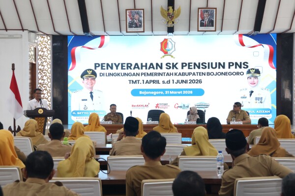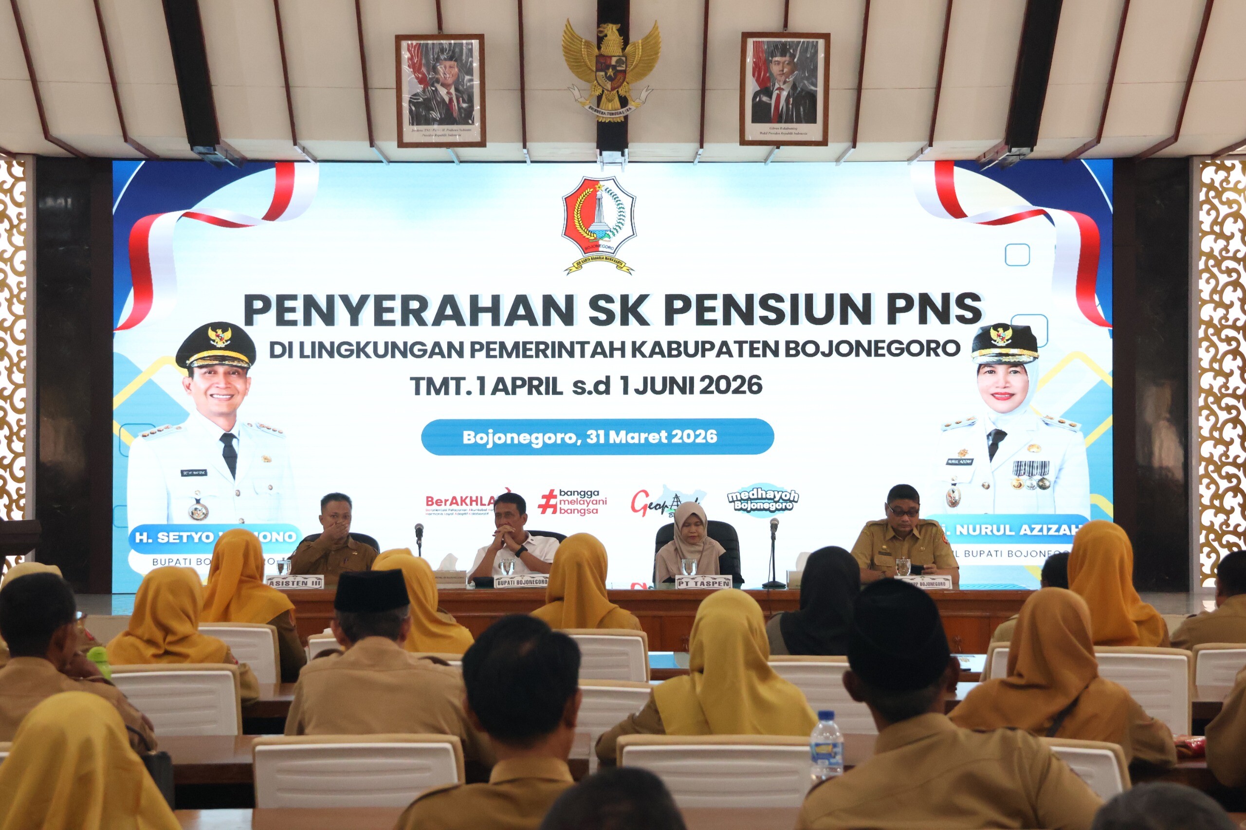 Bojonegorokab.go.id - Sebanyak 118 Pegawai Negeri Sipil (PNS) di lingkup Pemkab Bojonegoro resmi menerima Surat Keputusan (SK) Pensiun untuk periode terhitung mulai tanggal (TMT) 1 April hingga 1 Juni 2026. Bupati Setyo Wahono menyampaikan rasa terimakasih yang mendalam atas dedikasi para PNS yang bertahun-tahun membangun Bojonegoro.