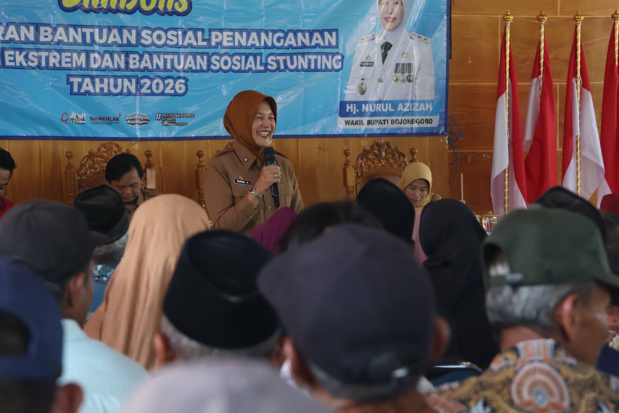 Bojonegorokab.go.id -  Pemkab Bojonegoro salurkan bantuan sosial (bansos) penanganan kemiskinan ekstrem dan bantuan sosial stunting di Kecamatan Gayam, Senin (13/4/2026). Penyaluran bansos dilakukan secara simbolis oleh Wakil Bupati Bojonegoro Nurul Azizah. Total anggaran yang disalurkan pada Keluarga Penerima Manfaat (KPM) sejumlah Rp 8,32 miliar.