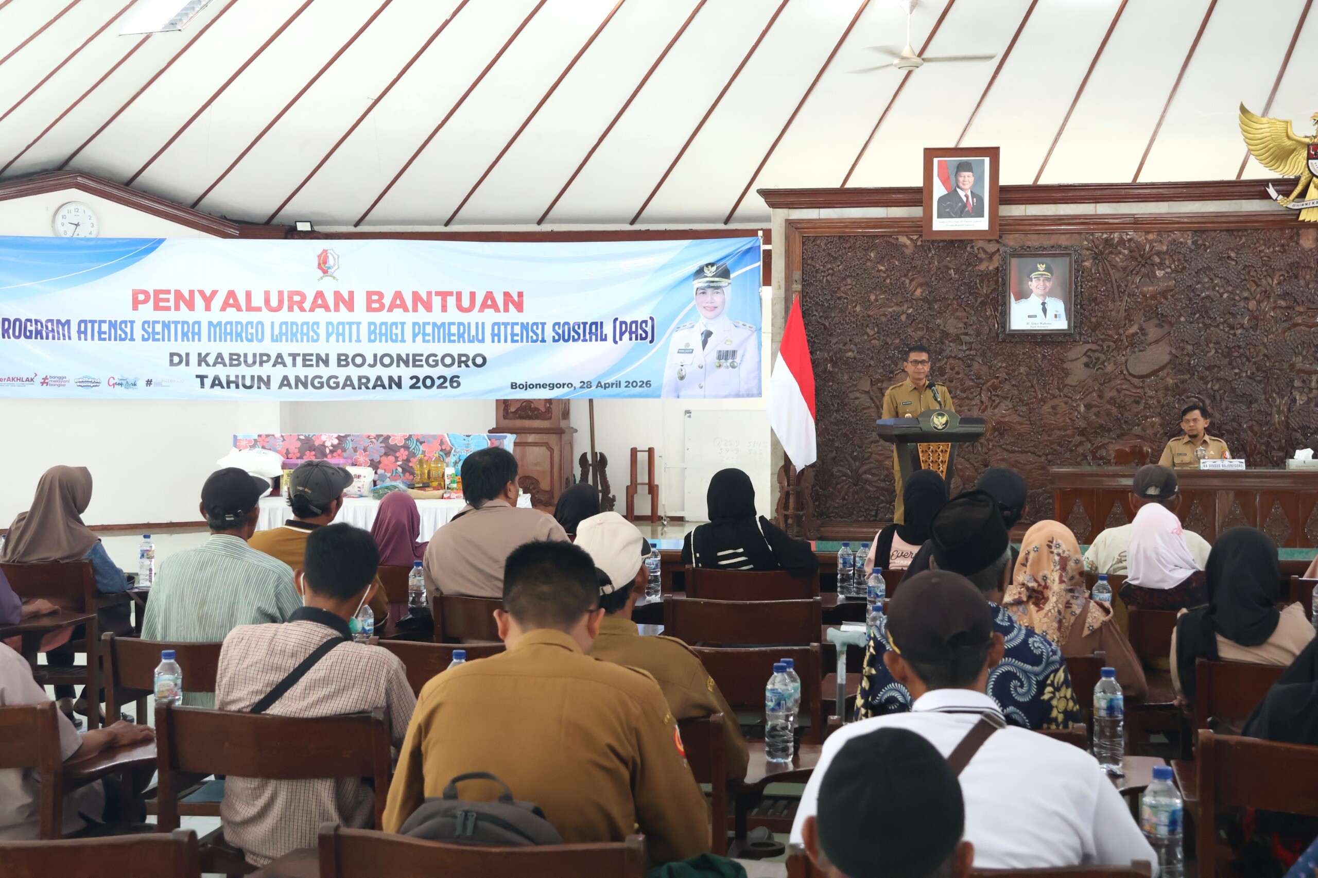 Bojonegorokab.go.id - Pemerintah Kabupaten Bojonegoro bersama Kementerian Sosial RI melalui Sentra Margo Laras Pati menyalurkan bantuan Program Asistensi Rehabilitasi Sosial (Atensi) bagi Pemerlu Atensi Sosial (PAS) di Kabupaten Bojonegoro. Kegiatan yang digelar Selasa (28/4/2026) di Pendopo Malowopati ini menjadi wujud nyata kolaborasi pemerintah pusat dan daerah dalam meningkatkan kesejahteraan masyarakat yang membutuhkan.