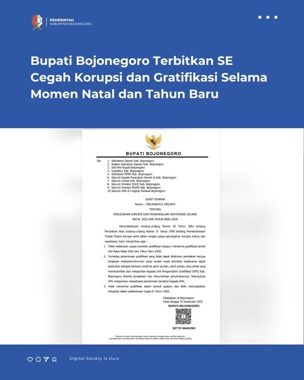 Bupati Bojonegoro Terbitkan SE Cegah Korupsi dan Gratifikasi Selama Momen Natal dan Tahun Baru