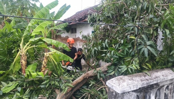 Petugas BPBD Bojonegoro sedang menangani pohon tumbang akibat angin kencang